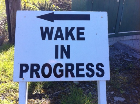 This one is my favourite – obviously standard issue for undertakers in Donegal. ‘Wake!’ on its own would have a suitably Easter feel. ‘In progress’ suggests that it may take some time.