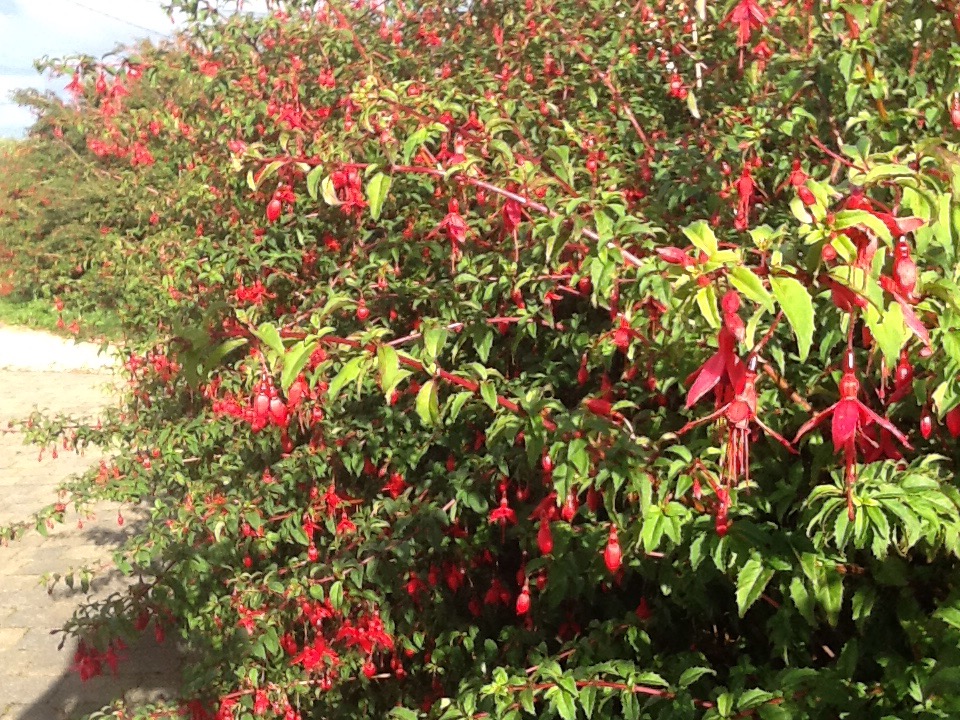 You know it’s a different climate out here in the Atlantic. It’s been raining ‘quite a bit’. We scan the forecast intently – knowing that we have already had the weather forecast for others tomorrow. And then there is the fuschia which grows wild in our hedge here but shrivels up and dies in the Blogstead weather, We are letting it bloom fairly chaotically even though I have periodic yearnings to get it into order. The other thing which happens here is that people respond to the rain by going visiting. People turn up and there’s talk …