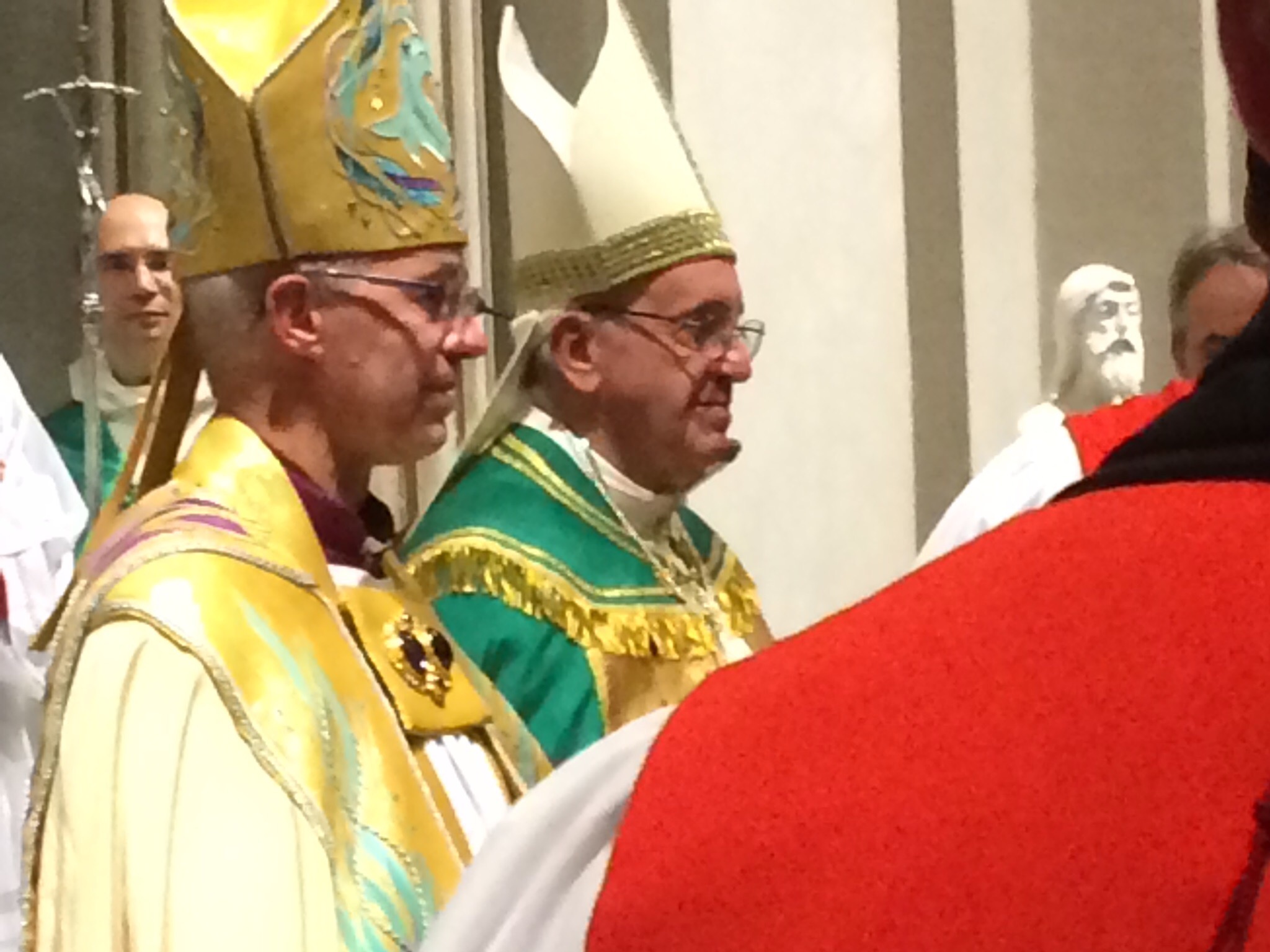 I’m in Rome at present for this anniversary – essentially it marks the 50th anniversary of the historic meeting of Archbishop Michael Ramsay with Pope Paul Vi. At that meeting, the Pope gave the Archbishop an episcopal ring which Archbishop Justin was wearing today. The crozier was a gift of the Pope – it is a modernistic replica of the crozier of Pope Gregory who sent Augustine to England. Music at the Papal Vespers was shared by the choirs of the Sistene Chapel and of Canterbury Cathedral.